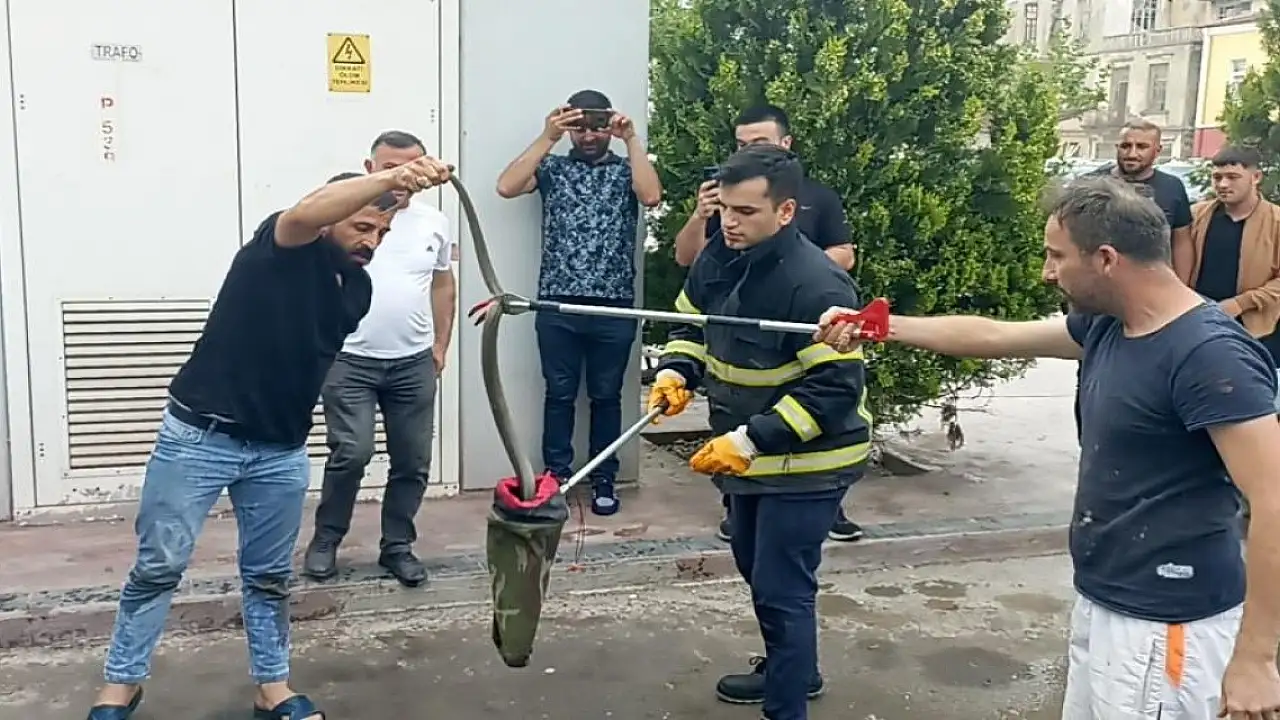 Cumhuriyet Meydanı'nda park halindeki araçların altında ilerleyen yılanı gören vatandaşlar, durumu itfaiyeye bildirdi. Yılanı bulunduğu yerden çıkartmak isteyen itfaiye ekipleri önce tazyikli su tuttu. İtfaiye ekipleri daha sonra kıskaçla çıkartmak için uğraşırken bir vatandaş yılanı kuyruk kısmından tutarak bulunduğu yerden aldı. Kıskaç yardımı ile torbaya koyulan 1 buçuk metre boyundaki yılan, doğal hayata bırakılmak üzere itfaiye erleri tarafından götürüldü. Toplanan meraklı vatandaşlar ise cep telefonlarıyla o anları görüntüledi.