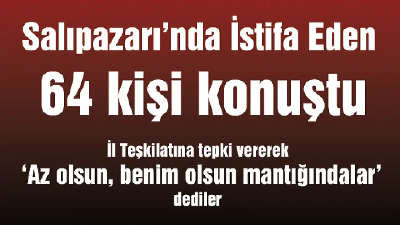 2014 Mart ayında yapılacak seçim öncesinde Salıpazarı’nda Refaattin Karaca’nın aday gösterileceğini açıklayan MHP Samsun İl Teşkilatı’na tepki gösteren Cavit Yıldırım ve beraberinde ki 64 kişi ilçede ki bir alabalık tesisinde istifasını açıkladı.