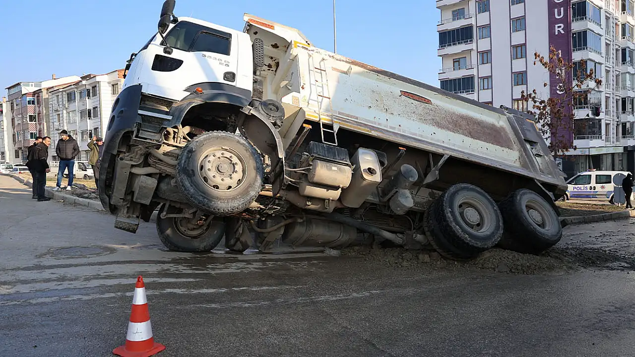Elazığ'da hafriyat dolu kamyon, asfalt yolun çökmesi nedeniyle oluşan 3 metre çapında, 2 metre derinliğindeki çukura düştü