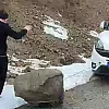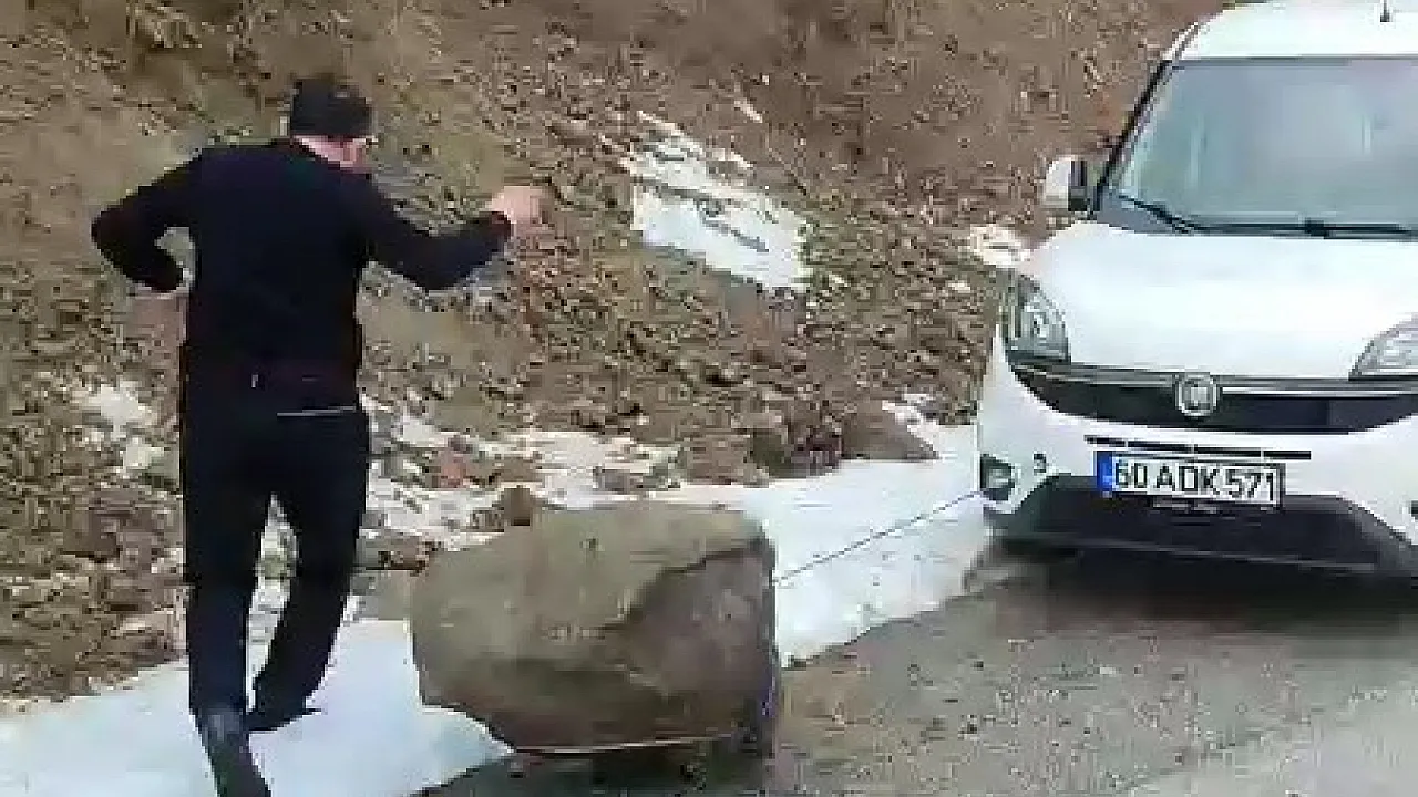 Tokat'ta seyir halindeyken yola düşen kaya parçası, vatandaşları dikkati ve duyarlı davranışı sayesinde tehlike oluşturmadan yol kenarına çekildi.
