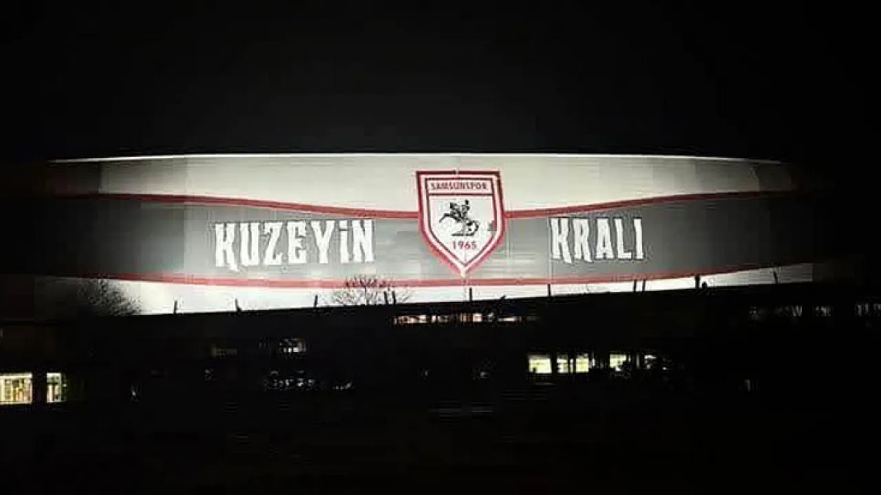 Samsun 19 Mayıs Stadyumu'nun dışında yer alan 'Kuzeyin Kralı' yazısı ve Samsunspor'un dev logosu Kulüp yönetiminin girişimleri doğrultusunda karanlık gecelerde bile gözle görünür hale geldi.