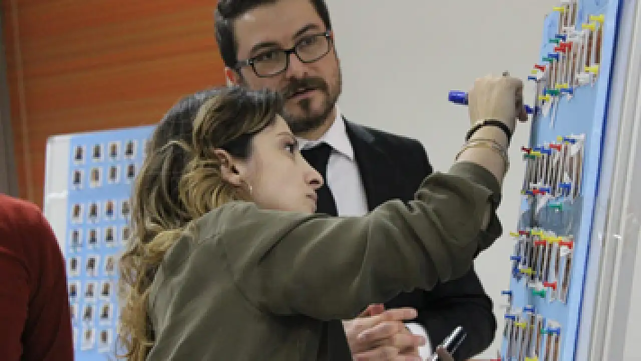 Amasya, Sinop, Samsun, Tokat, Ordu ve Çorum illerini kapsayan bölge müdürlüğünün değerlendirme toplantısına katılan yöneticiler, önlerine sürpriz şekilde konulan çalışanlarına ait karışık haldeki resim ve üzerinde isimlerin yazılı olduğu kağıtları eşleştirmeye çalışarak panoya astılar.