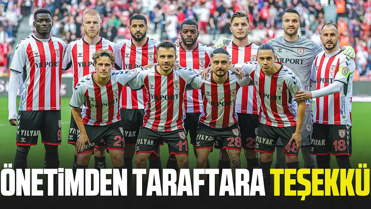"Büyük Samsunspor Taraftarı" başlığı ile yayımlanan mesajda, "Takımımızın her anında yanımızda olan, desteğini asla esirgemeyen siz değerli taraftarlarımıza en içten teşekkürlerimizi sunarız. Saha içinde ve dışında gösterdiğiniz büyük fedakarlık, coşku ve sevgi bizler için tarifsiz bir motivasyon kaynağıdır.Sevinçlerimizi ve üzüntülerimizi hep birlikte paylaştık. Bu sezon yaşadığımız her an, sizlerin coşkusuyla daha anlamlı hale geldi. Tribünlerdeki eşsiz enerjinizle takımımıza güç kattınız ve bizi her zaman ileriye taşıdınız. Başarılarımızda payınızın büyük olduğunu biliyoruz. Bu büyük ailemizin bir parçası olarak, birlik ve beraberlik içinde daha nice zaferlere yürüyeceğimize inanıyoruz. Sizlerin desteğiyle, yapılan doğru ve yanlışlardan ders çıkararak, önümüzdeki sezonda çok daha başarılı olacak, hedeflerimize adım adım yaklaşacağız. Her zaman yanımızda olduğunuz için teşekkür eder, en içten sevgi ve saygılarımızı sunarız" denildi