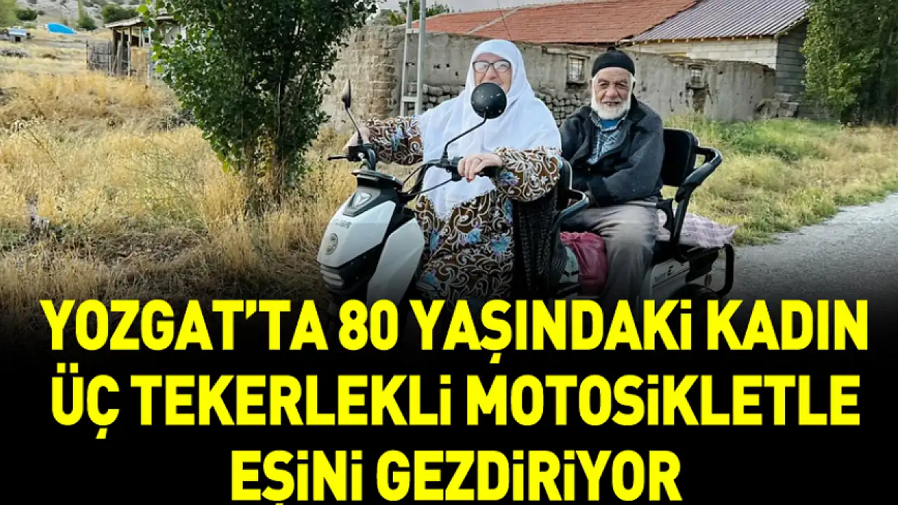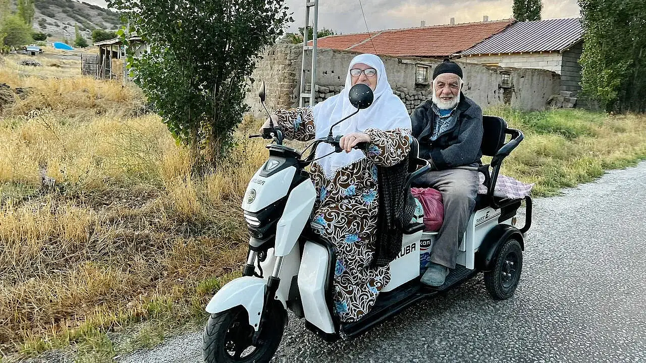 Yozgat'ın Sorgun ilçesine bağlı bir köyde yaşayan 80 yaşındaki Gülfidan Bekdemir, yaşlılıkla birlikte yürümekte zorlanınca üç tekerlekli motosiklet kullanmayı öğrenerek 85 yaşındaki eşi Yusuf Bekdemir'i köyde gezdiriyor.