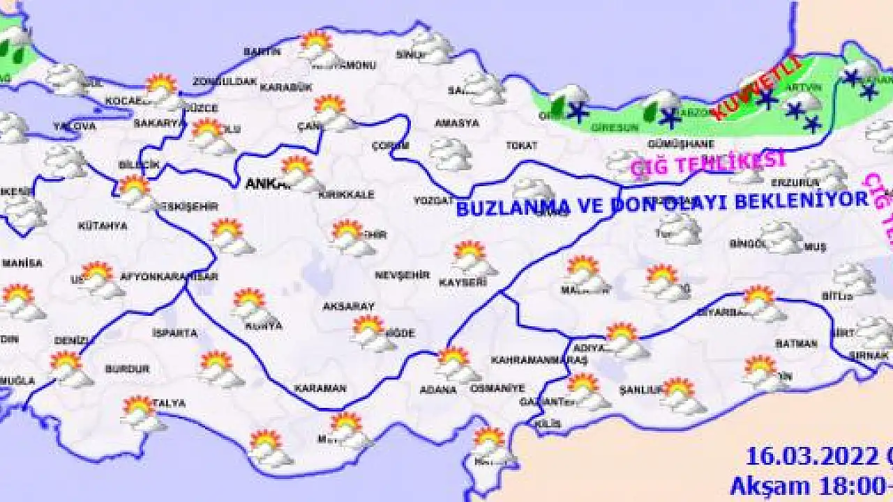 Meteoroloji Genel Müdürlüğünden alınan tahminlere göre yağışların; İç Ege, İç Anadolu'nun kuzeybatısı, Doğu Karadeniz'in iç kesimleri ile Aksaray, Nevşehir, Yozgat, Erzurum, Kars, Bingöl, Muş ve Bitlis çevrelerinde yerel kuvvetli olması bekleniyor.