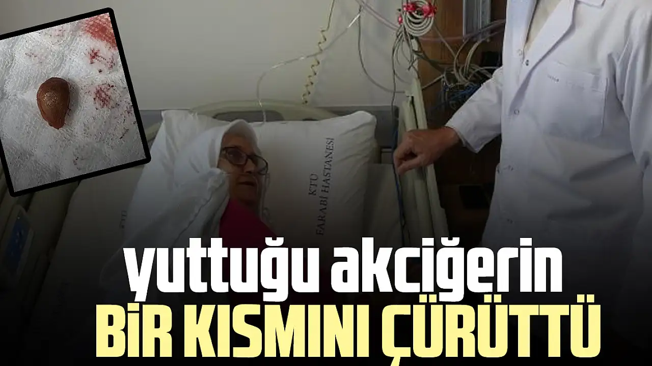 Trabzon'un Akçaabat ilçesinde yaşayan 66 yaşındaki Fatma Karabacak'ın yuttuğu karayemiş çekirdeği soluk borusundan akciğerine gitti, akciğerin bir kısmını çürüttü.