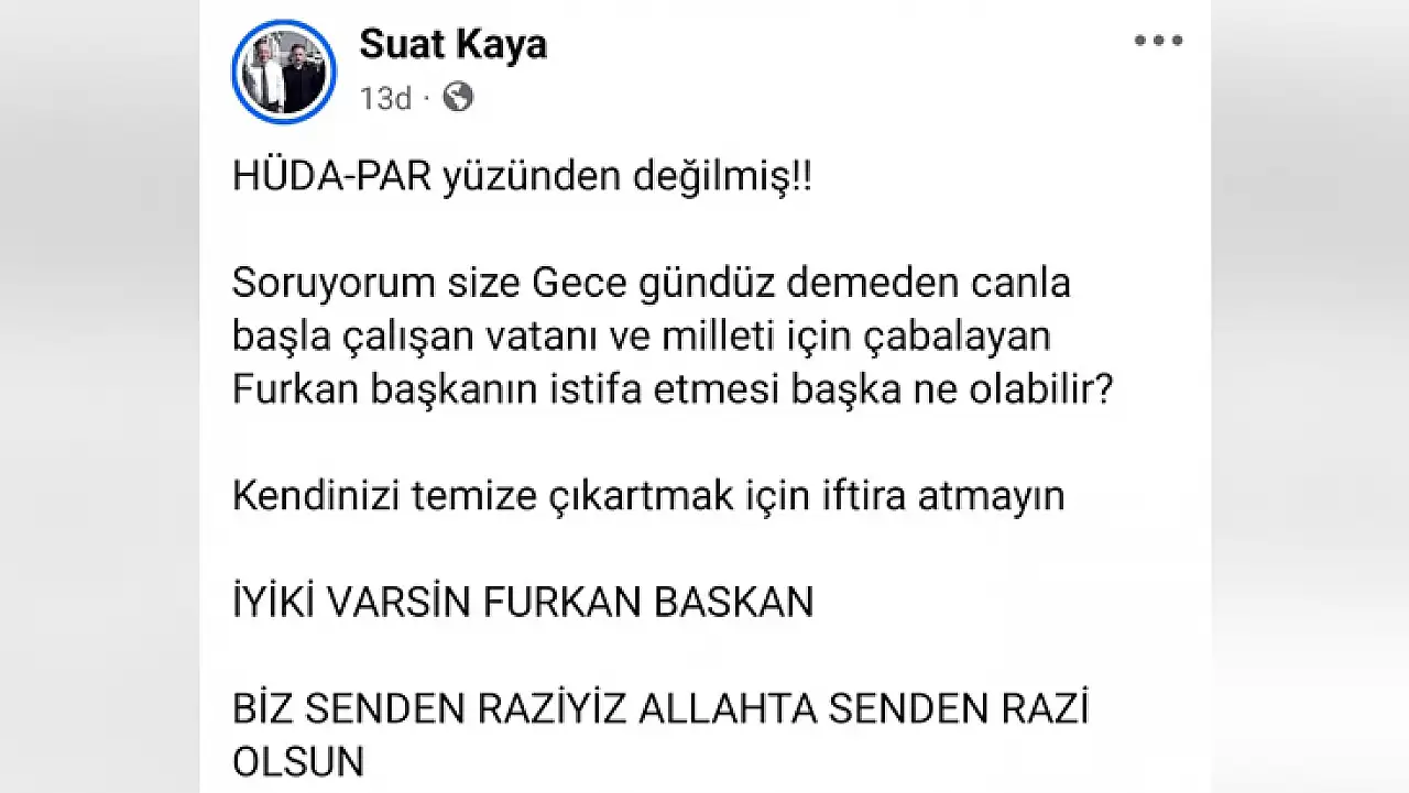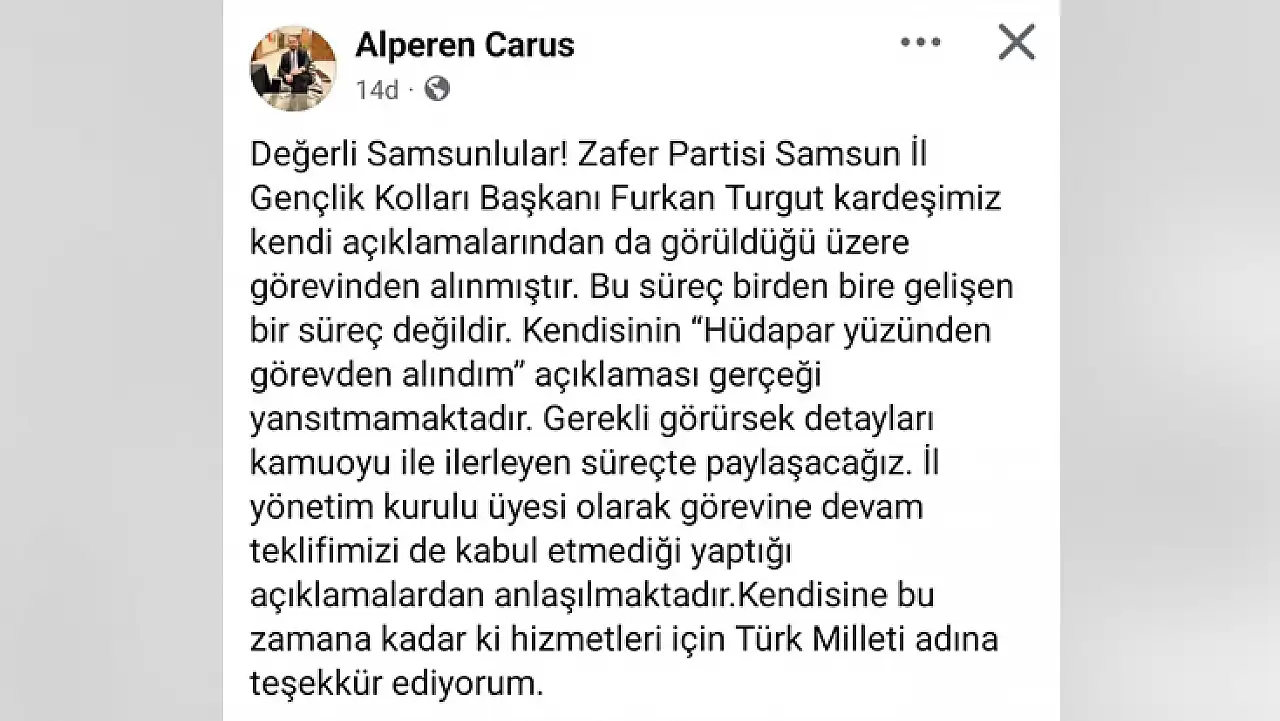 Kaya, sosyal medyadan “İyi ki varsın Furkan başkan” mesajıyla Turgut’a destek verirken, Furkan Turgut ise İl Başkanı Carus’a sosyal medya üzerinden verdiği cevapta, “HÜDAPAR olayından sonra birden görevden alındım” sözleriyle tepkisini dile getirdi.